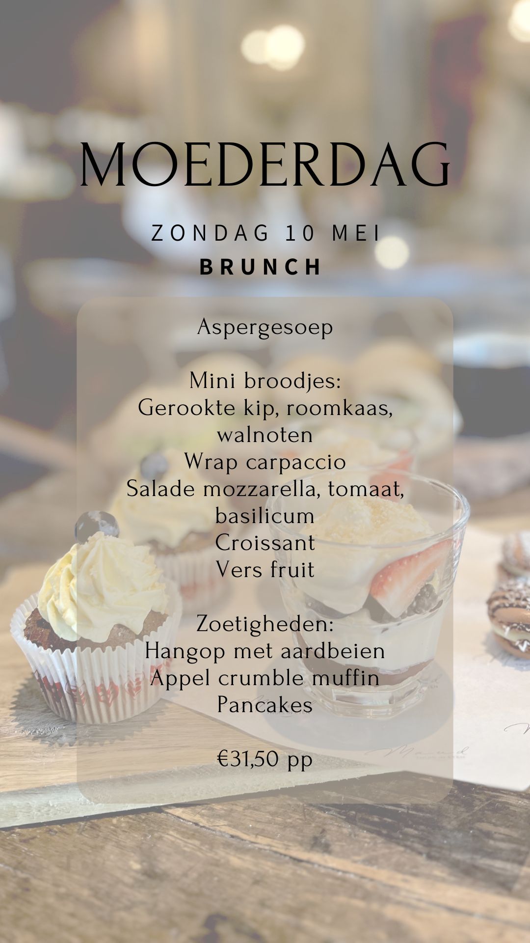 Zondag 10 mei is het dé dag om alle moeders in het zonnetje te zetten. Geniet van een uitgebreide brunch vol verfijnde smaken. Reserveren mogelijk tussen 11.00 en 13.00 uur (uitsluitend Moederdag brunch)